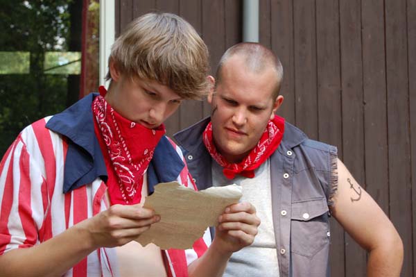 Tijdens het drinken van een overheerlijke mok met limonade en een snoepje komen de 2 piraten, Linke en Robin binnen gelopen met een stuk van de schatkaart. ze vertellen dat ze deze gewoon op het eiland hebben gevonden. Terwijl ze dat heel enthousiast vertellen wordt de rust bruut verstoord door Slechte Rik die het stuk kaart uit hun handen trekt en wegrent. Helaas weten we hem niet te pakken te krijgen, maar laat hij wel een hele stapel met blaadje vallen. Het is allemaal geheimschrift en een route. Als we het geheimschrift oplossen hebben we de volgende zin: "HAHA De esta's vinden nooit de kaart naar mijn hol. De kaart ligt bij een boom".