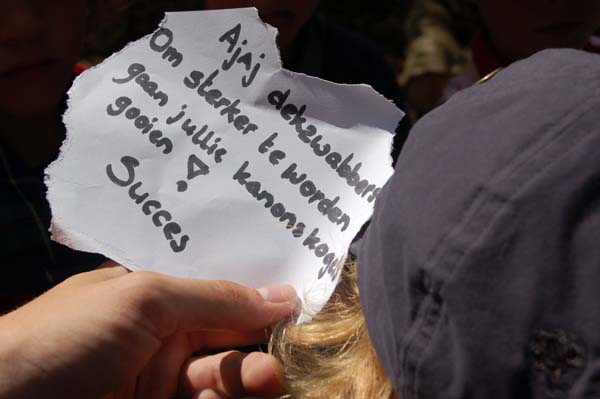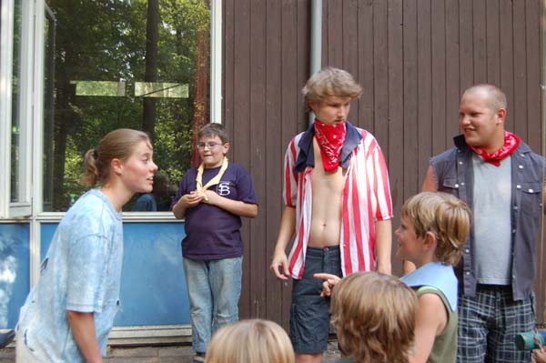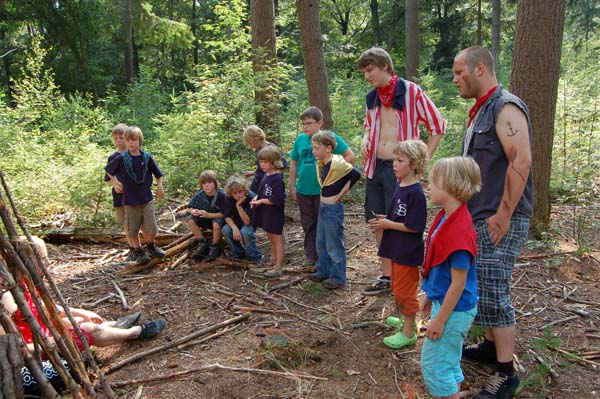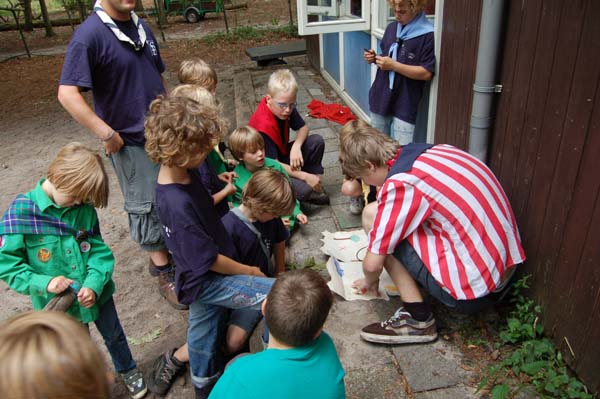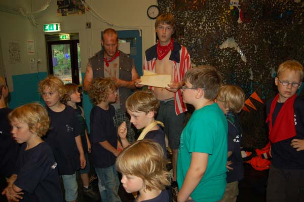 Vanochtend waren alle kinderen al luid aan het zingen voor Arnant die jarig is vandaag. Sahi heeft voor raampje gedreigd met de slaap totums daarna waren ze ook echt stil, zodat de leiding met veel kabaal naar binnen kon stormen om luidruchtig te gaan zingen. En vervolgens de kaarten en cadeautjes te overhandigen. Toen Arnant buiten kwam zag hij dat er buiten en binnen versiering voor hem hing. Na de corvee kwamen opeens Sammie en Slechte Rick aangelopen. We waren erg benieuwd want Slechte Rick had gisteravond de Kapitein ontvoerd, wat zou hij nu van ons willen? Al snel werd duidelijk dat Slechte Rick het zou leuk vond met ons de afgelopen dagen, dat hij vandaag wel weer met ons spelletjes wilde spelen. Maar dat mocht hij natuurlijk niet zomaar vonden de kinderen, daar moet zij wat voor terug doen. Zij moest in plaats van Slechte Rick een Goede Rick worden. Sammie had alvast met de kapitein daar over gepraat en die leken het ook een goed idee dat Slechte Rick een Goede Rick werd. Nadat Sammie de kinderen had overgehaald om toch spelletjes met de kinderen te gaan doen gingen we aan de slag. Omdat het vandaag mooi weer was besloten we om water spelletjes te doem, we zijn begonnen met een sponzen spel. De kinderen deelden zelf de groep in tweeën en gingen in een rij staan. Voor hun werd een emmer met water gezet en achter het rijtje een lege emmer ze moesten doormiddel van de spons de lege emmer te vullen met het water uit de volle emmer. Het groepje van Sammie had gewonnen. Na dit spel zijn we waterballon volleybal gaan doen. In het midden is een groot zeil opgehangen daar moesten we waterballonnen overheen gooien en die dan proberen te vangen en weer terug te gooien. Dit spel eindigde in een reuze watergevecht. Met alle spullen die de kinderen konden vinden, teiltjes, emmers, sponzen, waterpistolen enz. Na dit natte gevecht was het al weer tijd om te eten en dus voor Sammie en Goede Rick tijd om weg te gaan. Sammie had met de kapitein gepraat en een baantje geregeld voor Goede Rick vanaf nu is zijn taak op het schip het bedienen van het kanon. Als dank van de piraten kregen alle kinderen een gouden munt voor aan de hoofd totum. Na het eten was het tijd voor de kinderen om even te gaan liggen. Na het rust uur stond er een leuke verrassing op de kinderen te wachten en vooral voor Arnant want het was tijd voor taart (appelkruimel). Na het zingen van verjaardagsliedjes zo hard dat de koningin het kon horen, mochten de kinderen gaan genieten. De middag was voor de kinderen om zelf in te vullen. Veel hebben hier geoefend voor de bonte avond en hun vrije totum gemaakt of geknutseld. In deze tijd kon de leiding de barbecue voorbereidden na een frisse start met het eten begon het helaas te regenen. De leiding heeft snel een zeiltje gespannen zodat we toch nog buiten konden eten, de bonte avond is naar binnen verplaatst. Na veel leuke moppen, toneelstukjes, dans acts en kunstjes werd de bonte avond met een spannend verhaal afgesloten.