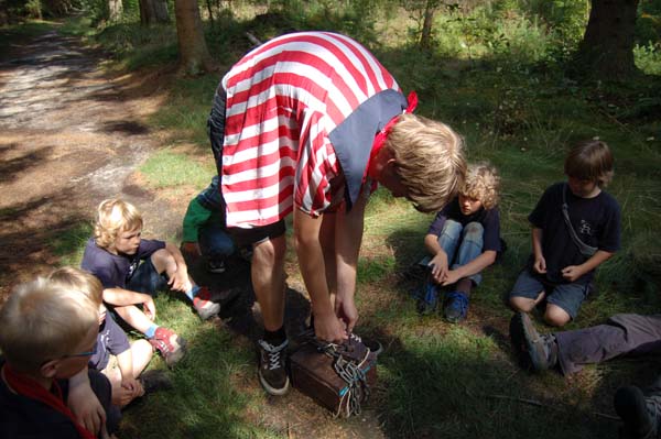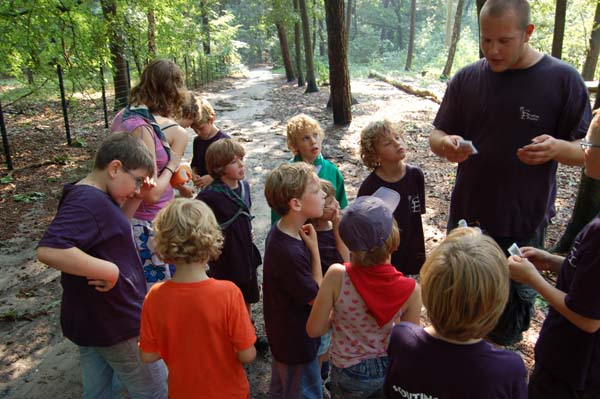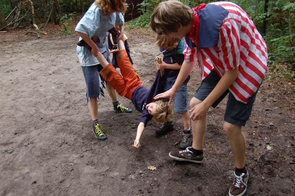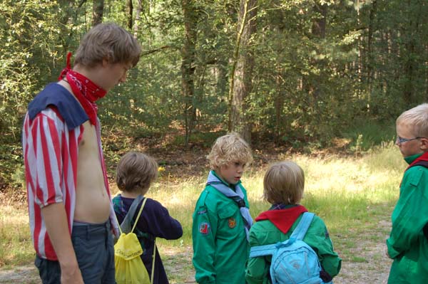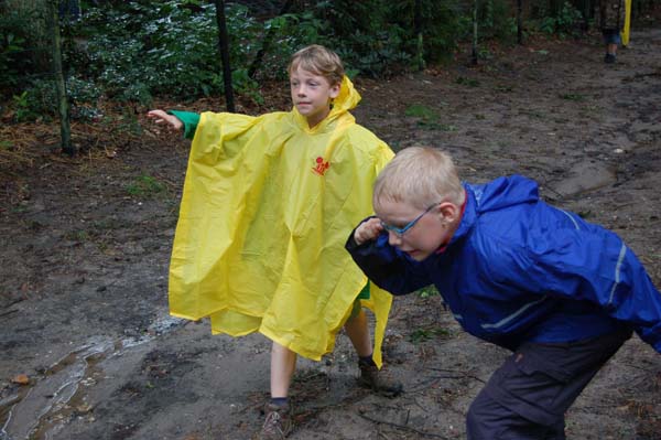 Als we 's middags na de lunch en het rustuur naar buiten gaan zijn Sammie en Linke ook nog steeds in de buurt en gaan we opzoek naar de hut van de drenkeling. Onderweg nemen we even pauze en spelen we indianen kwartet en het spel: vuur, spons, water. Het vuur verslaat de spons, de water het vuur en de spons het water.