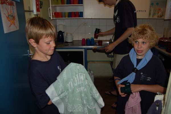 Na de ochtend gymnastiek zijn Sammie en Linke gebleven om te ontbijten. Ook hebben ze de kinderen geholpen met het corvee, zij weten desnoods als geen ander hoe je het dek moet schrobben.